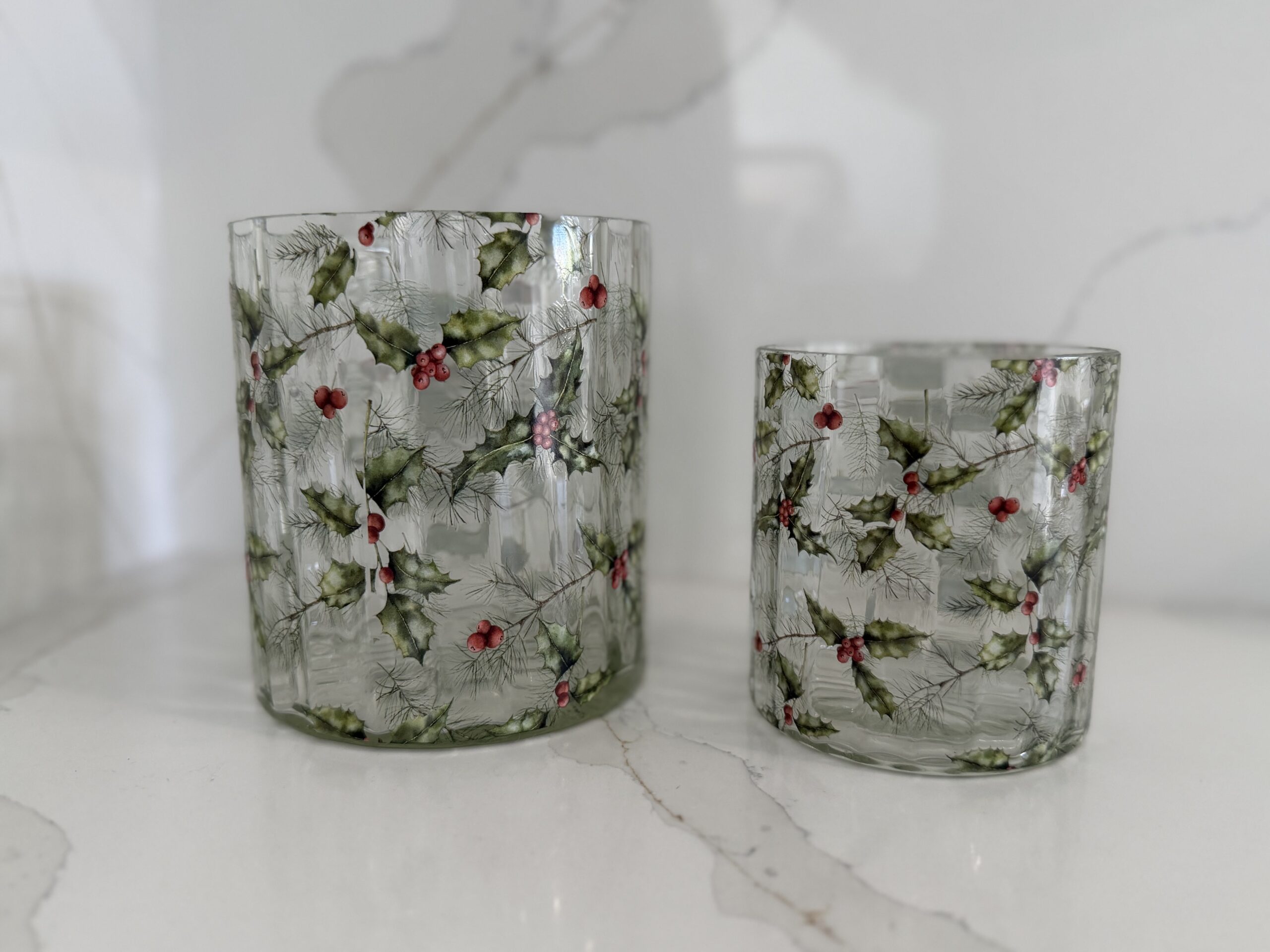 This charming duo of holly glasses adds a festive touch to any home. Perfect for holding tea lights or fairy lights they create a warm seasonal glow. Ideal for mantels, tables or windowsills and a lovely addition to your Christmas décor.
